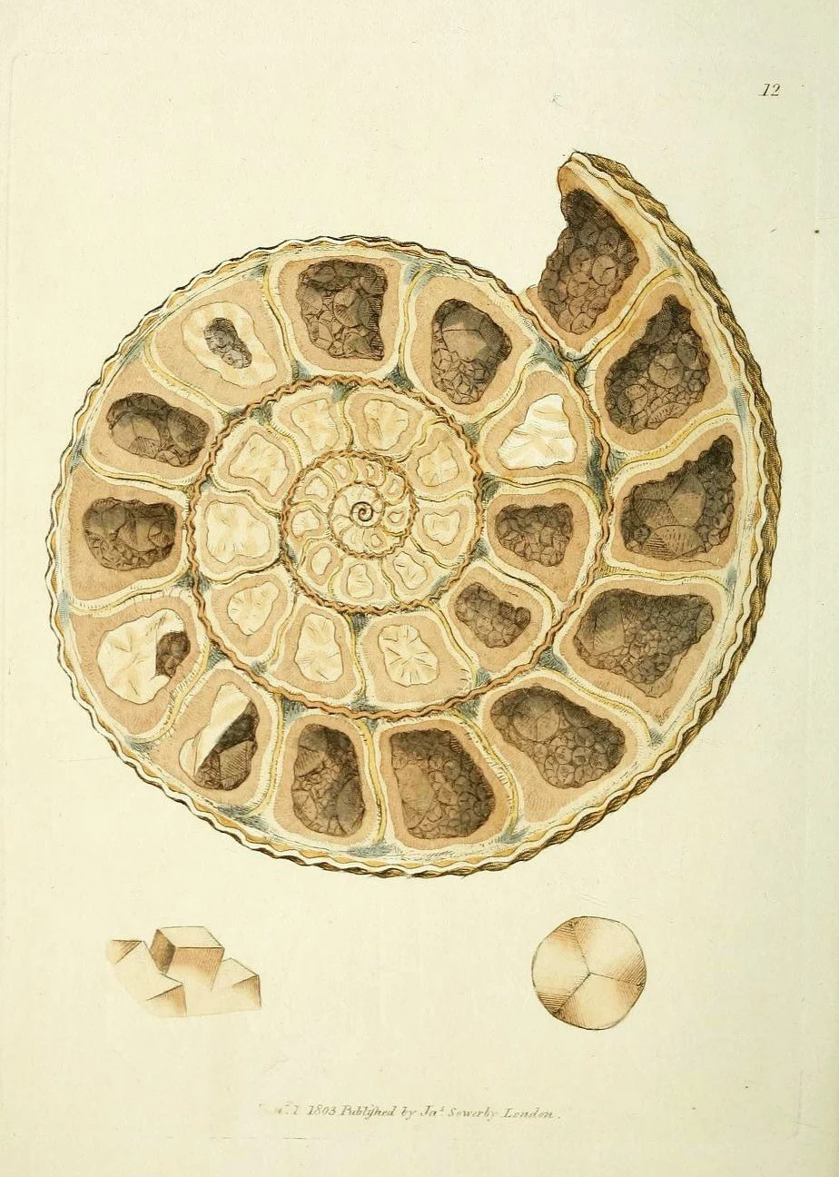Detailed illustration of a fossilized ammonite shell cross-section, displaying spiral chambers, with two smaller diagrams below it showing different views of the shell, published in 1803 by J. Sowerby in London.